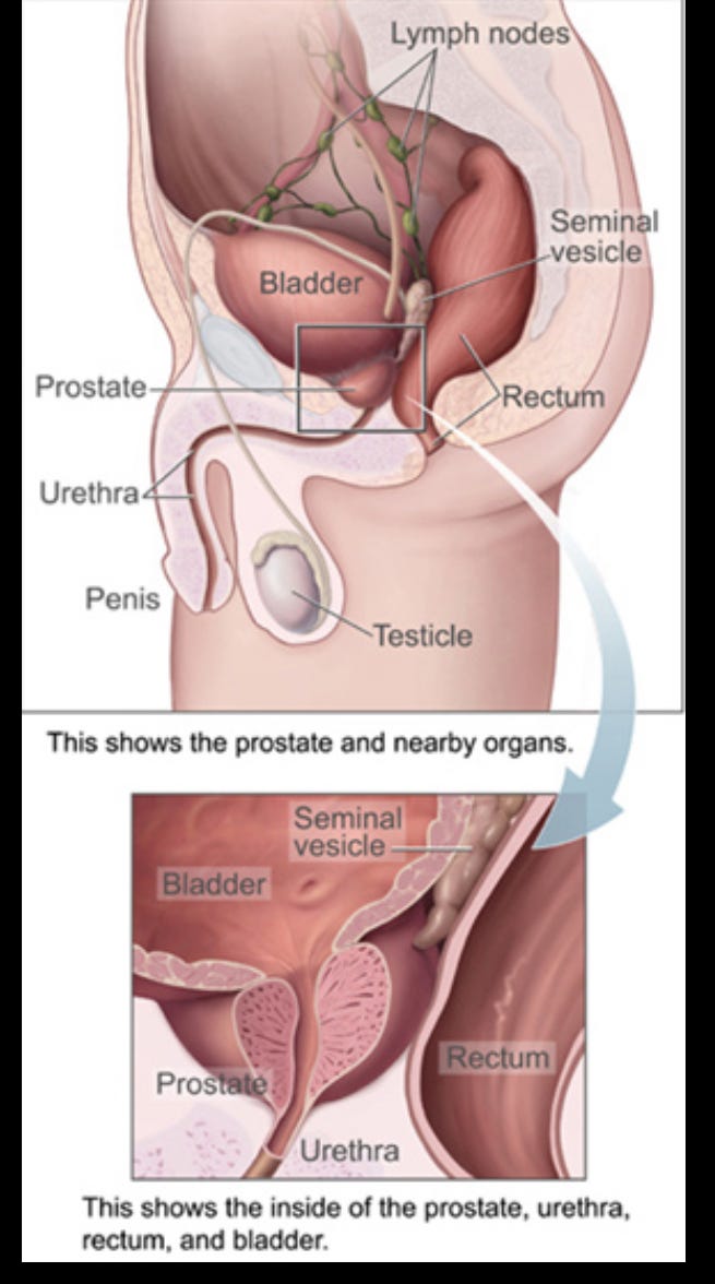 The prostate is part of the reproductive system for males. It is a walnut-sized gland that is located between the bladder and the internal end of the penis. Speaking simply, it produces fluid that mixes with semen and provides nourishment to keep sperm cells alive for reproduction. The gland is responsible for ejaculation and rhythmically contracts during orgasm forcing the fluid and semen through the urethra to facilitate fertilization. The prostate also plays an important role in helping a male hold urine.